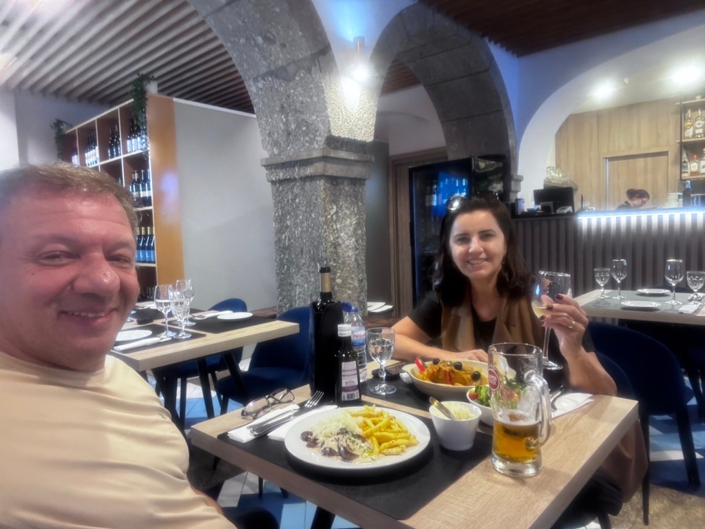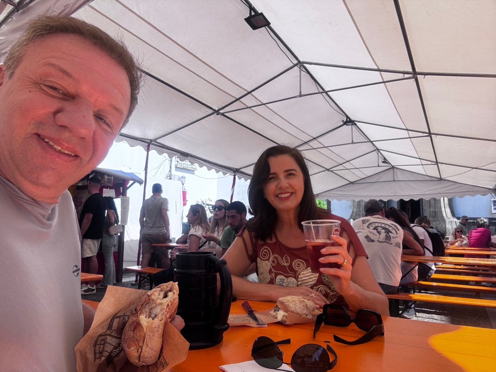 Dia 25 de maio saímos para passear e almoçar nas barracas da Festa Braga Romana, comemos Prego com queijo da Serra, que é um sanduíche com carne de vitela grelhada, queijo português de ovelha derretido e pão com casca crocante, uma delícia. Para beber chopp e sangria de vinho tinto.