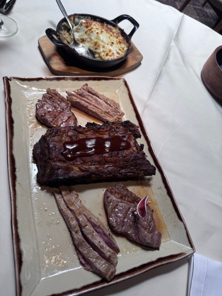Pedimos um Vinho Branco Assobio e um chopp da Heineken, uma Parrilha Pequena e uma Batata em Bechamel Gratinada.