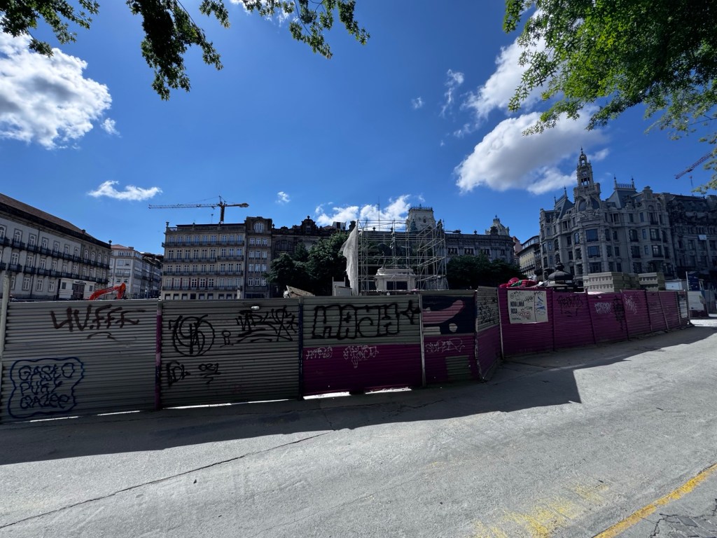 Saindo do mercado do bolão, passeamos pela cidade chegamos na praça onde tem a estátua Dom Pedro IV, a qual se encontra em obra desde outubro/2024 quando estivemos aqui na última vez.