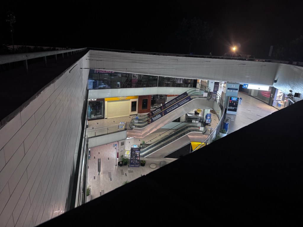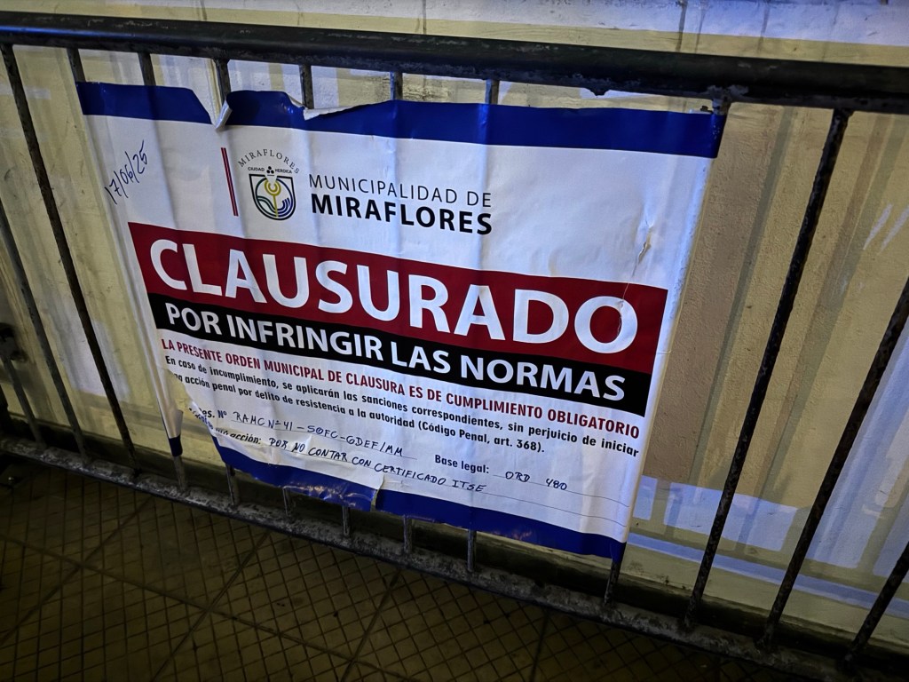 Chegamos ao shopping Larcomar às 18h41 e estava fechado, por determinação da Prefeitura de Miraflores, por suspeita de deficiências estruturais.