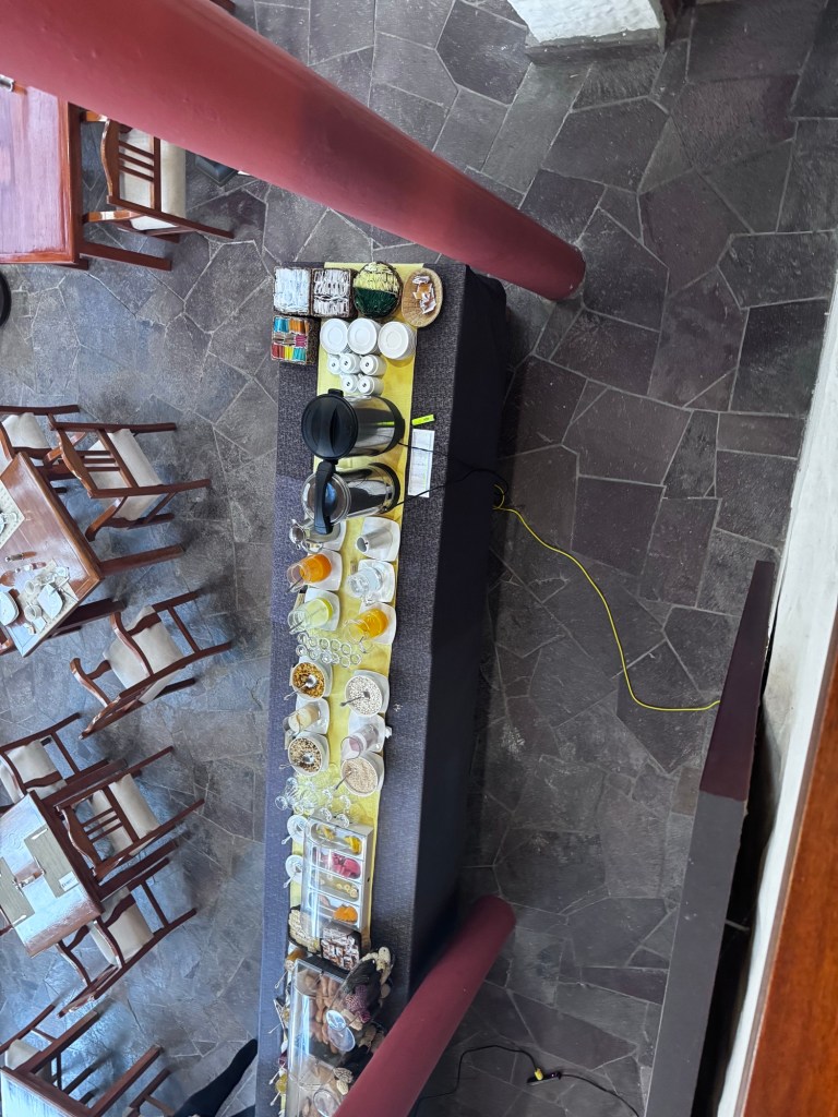 Café da manhã corrido para pegar o transfer, com nossa guia Ângela.