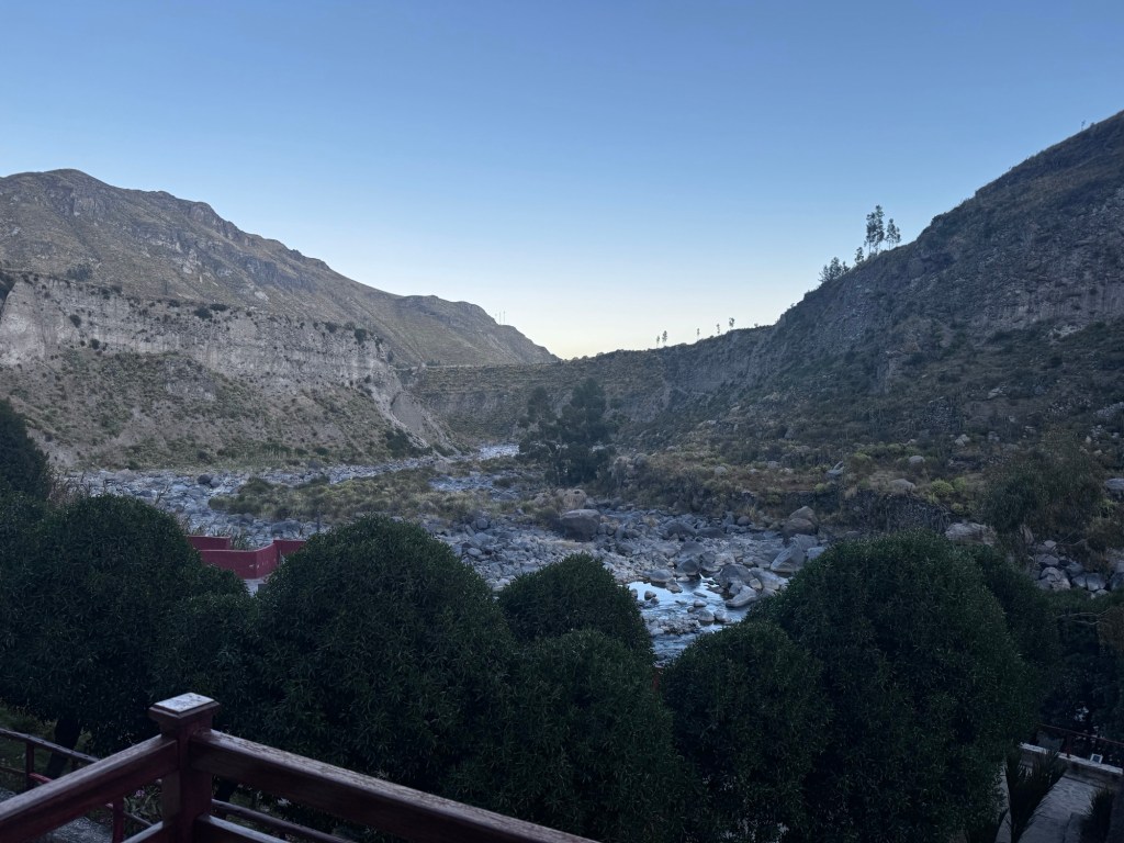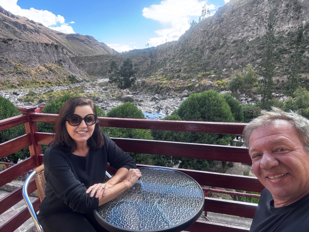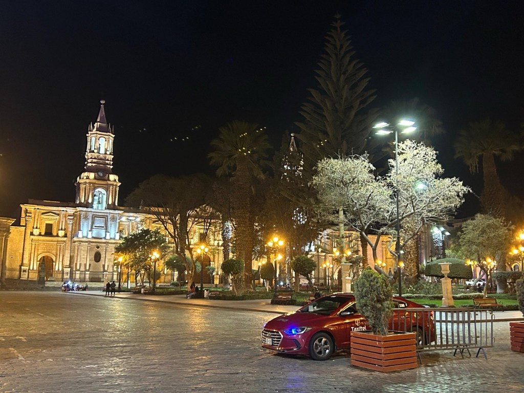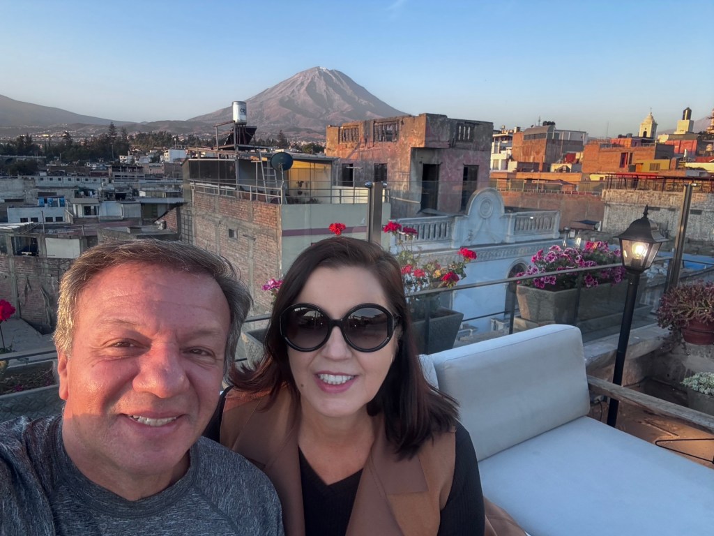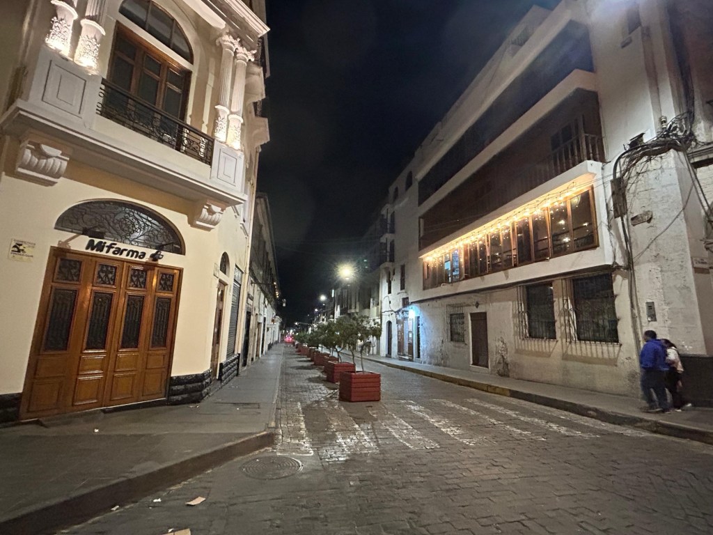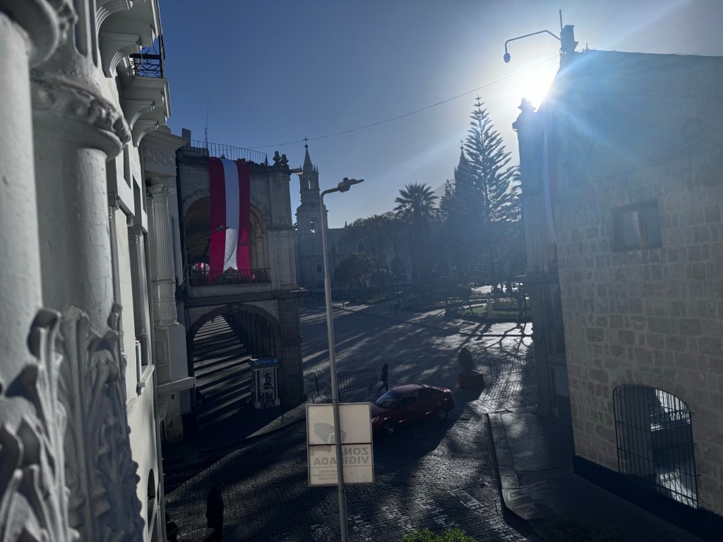 Depois de uma viagem deliciosa, com muito conforto, chegamos em Arequipa e ficamos hospedados no Hotel Plaza Central, bem central, mas com uma escadaria para chegar na recepção.