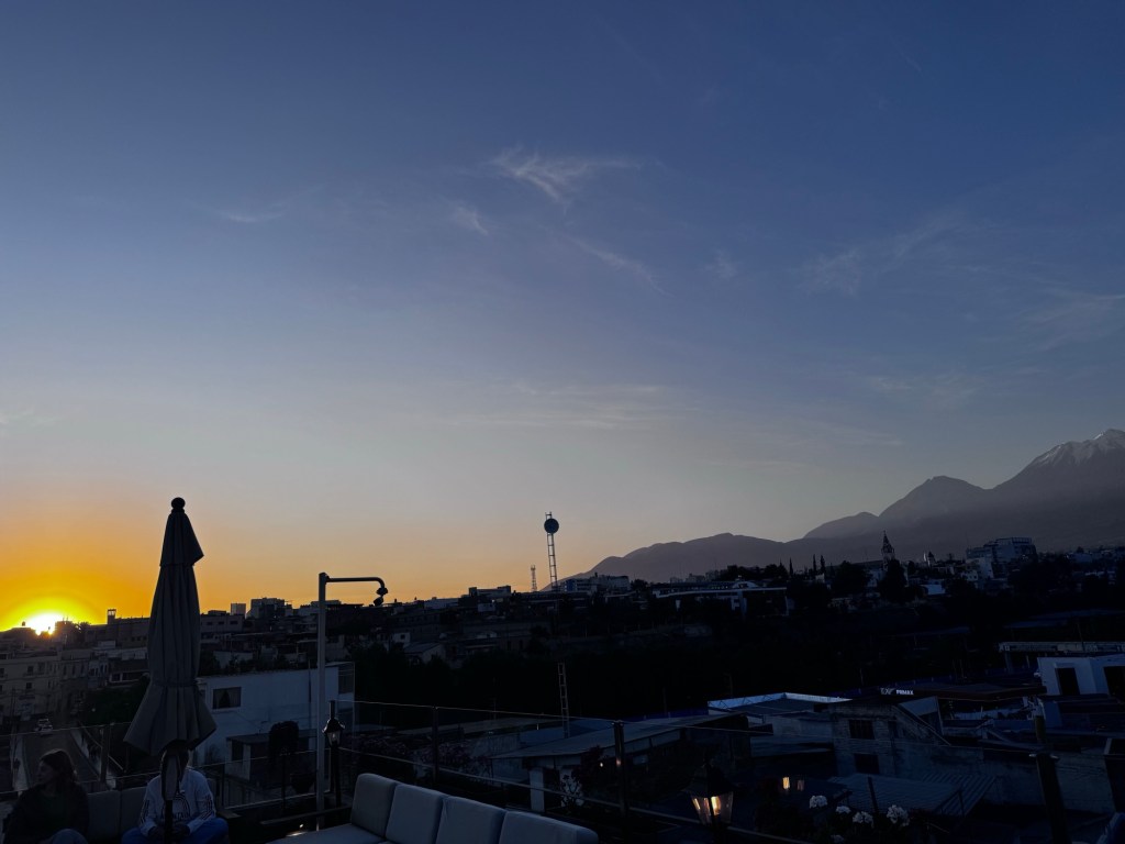 Que proporciona à vista dos vulcões Misti e Chachani, visual lindo acompanhado de um pôr do sol maravilhoso.