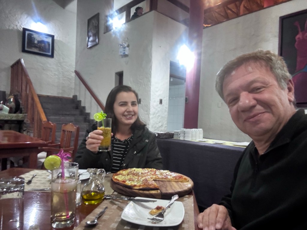 Descanso no quarto e fomos jantar no restaurante do hotel, pizza com chilcanos, tudo muito gostoso.