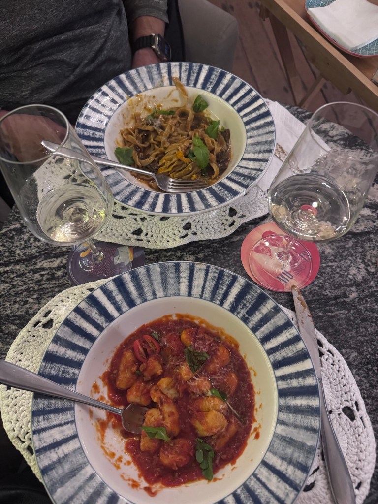 Pedimos um vinho branco italiano com as uvas Chardonnay e Pinot Grigio, estava delicioso. De entrada pedimos uma focaccia. Trato principal fettuccine com molho de fungui negro e nhoque a bolonhesa.