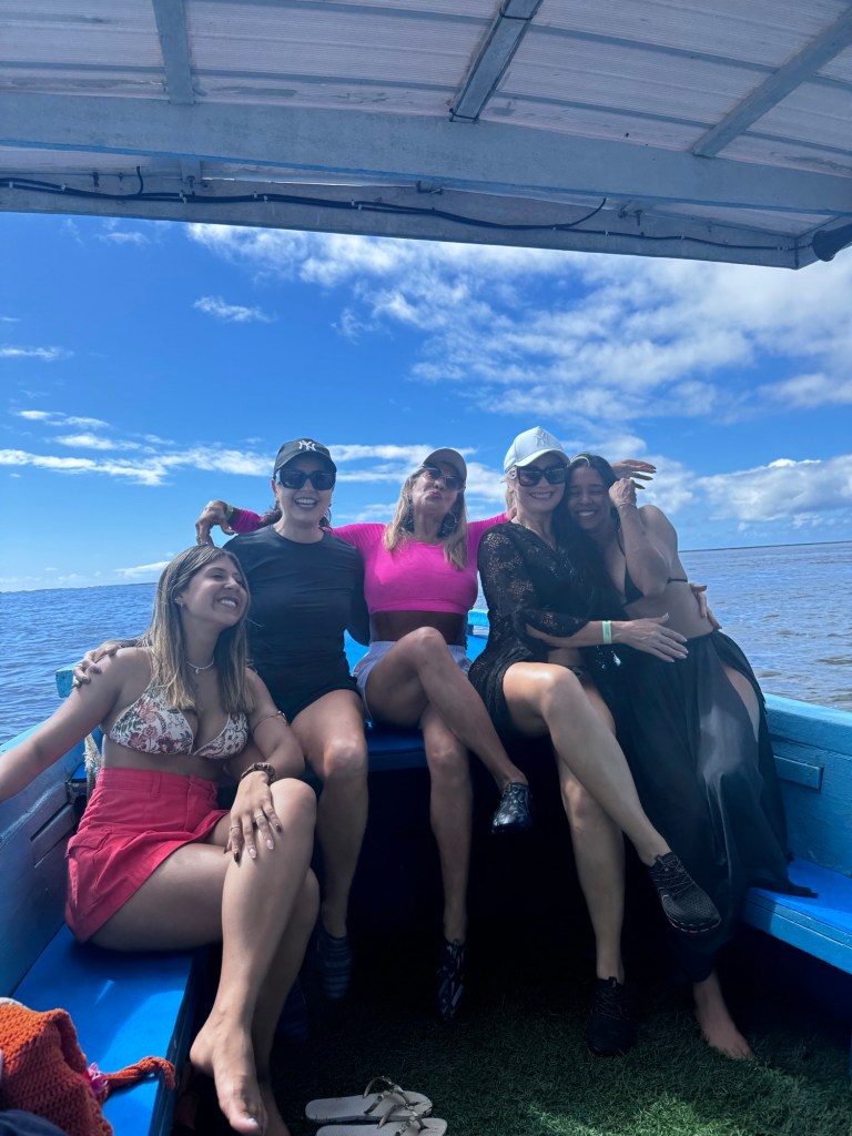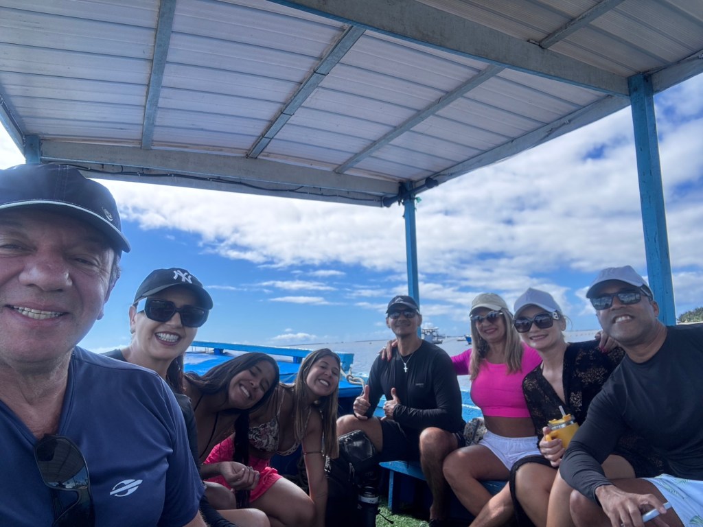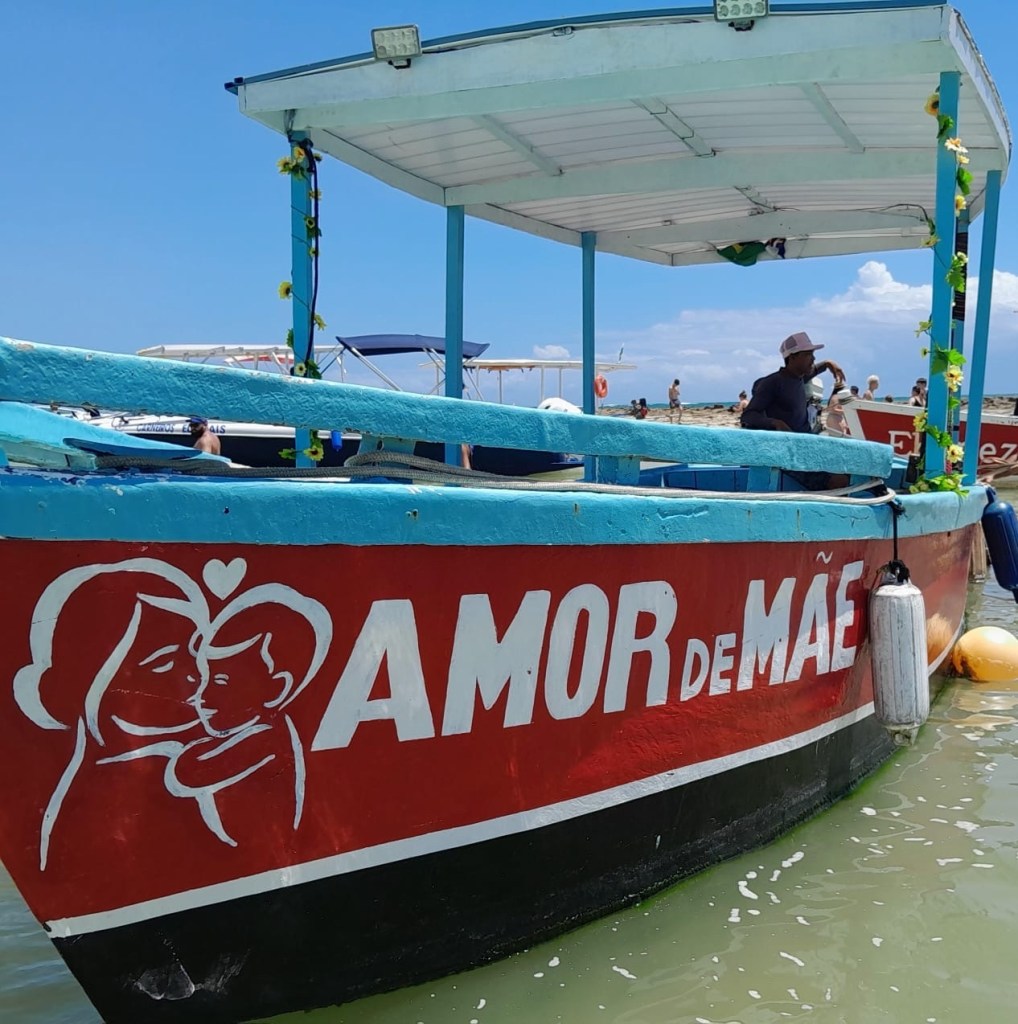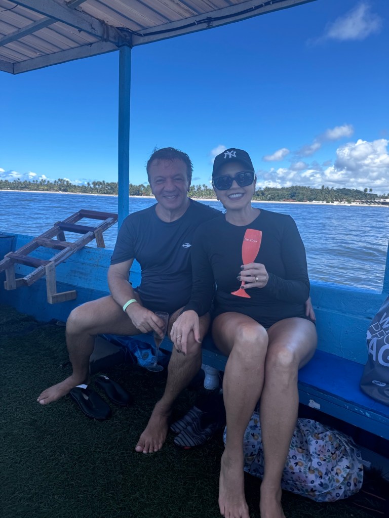 O ponto alto absoluto da viagem foi o passeio exclusivo com Rosinaldo no barco “Amor de Mãe” (@amordemaepraiadoscarneiros01), uma embarcação privativa para até 8 pessoas que nos proporcionou uma experiência marítima inesquecível.
