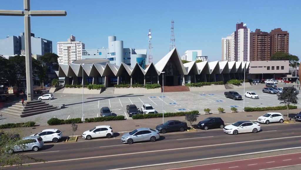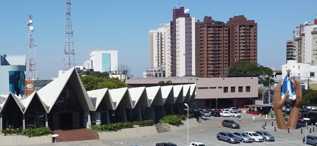 Sobrevoamos a impressionante **Catedral Nossa Senhora Aparecida**. A construção de arquitetura moderna e arrojada nos chamou atenção pelas linhas contemporâneas que contrastam com o tradicional estilo das igrejas católicas. Suas formas geométricas e vitrais coloridos criam um ambiente de contemplação única.