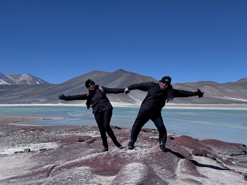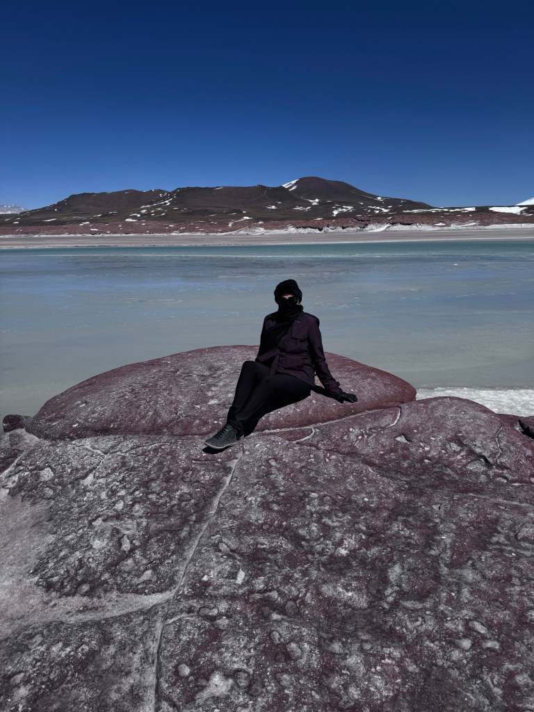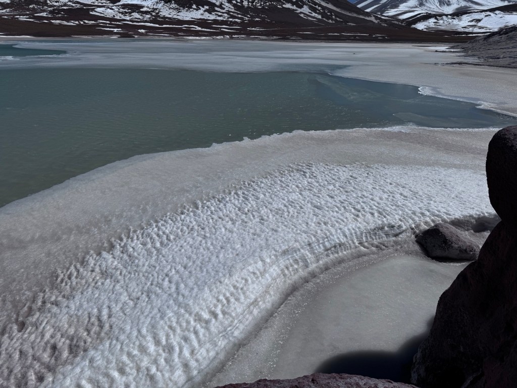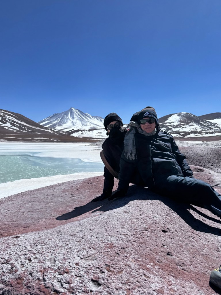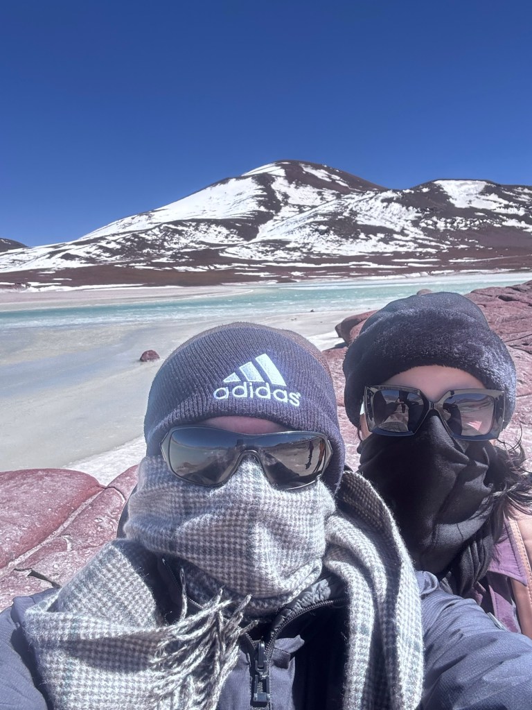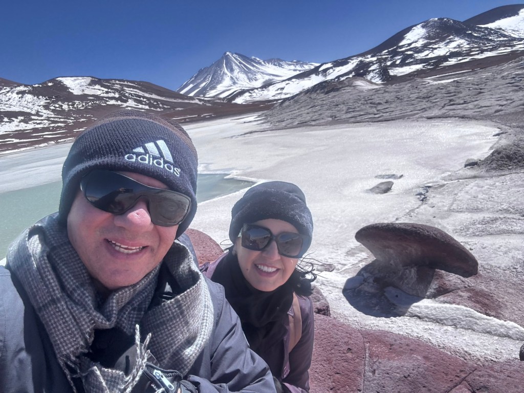 Às 11h03, alcançamos um dos pontos mais dramáticos de nossa jornada: Piedras Rojas, situado a vertiginosos 3.975 metros de altitude. As condições eram extremas – ventos de até 80 km/h e temperatura de apenas 4 graus Celsius. A paisagem era impressionante: formações rochosas avermelhadas contrastando com topos de montanhas nevadas ao redor e, à frente das pedras, um lago congelado que completava o cenário surreal.
