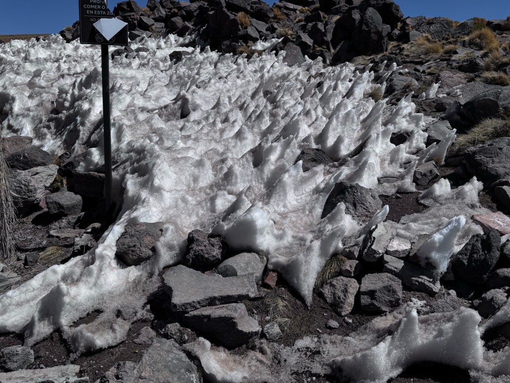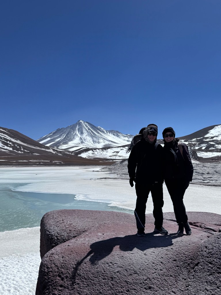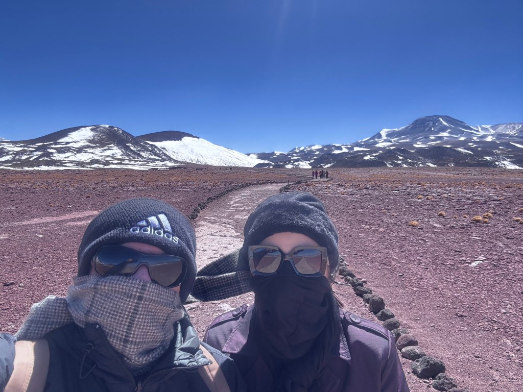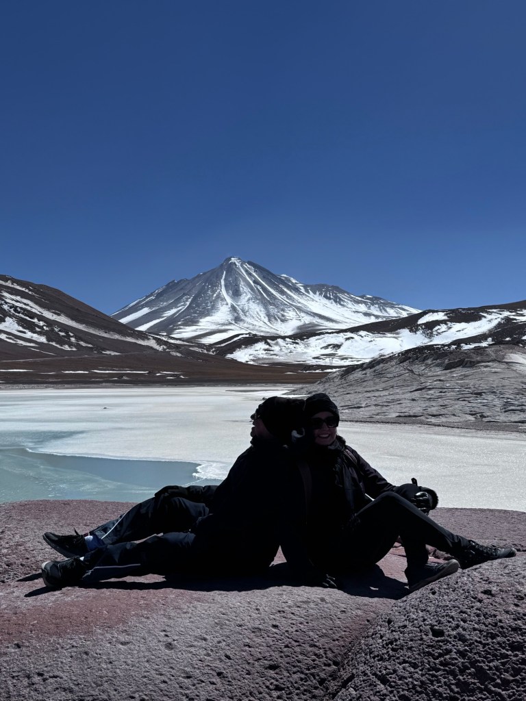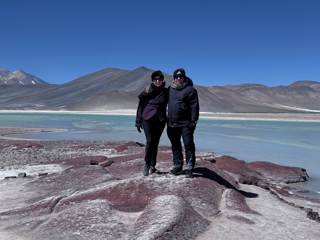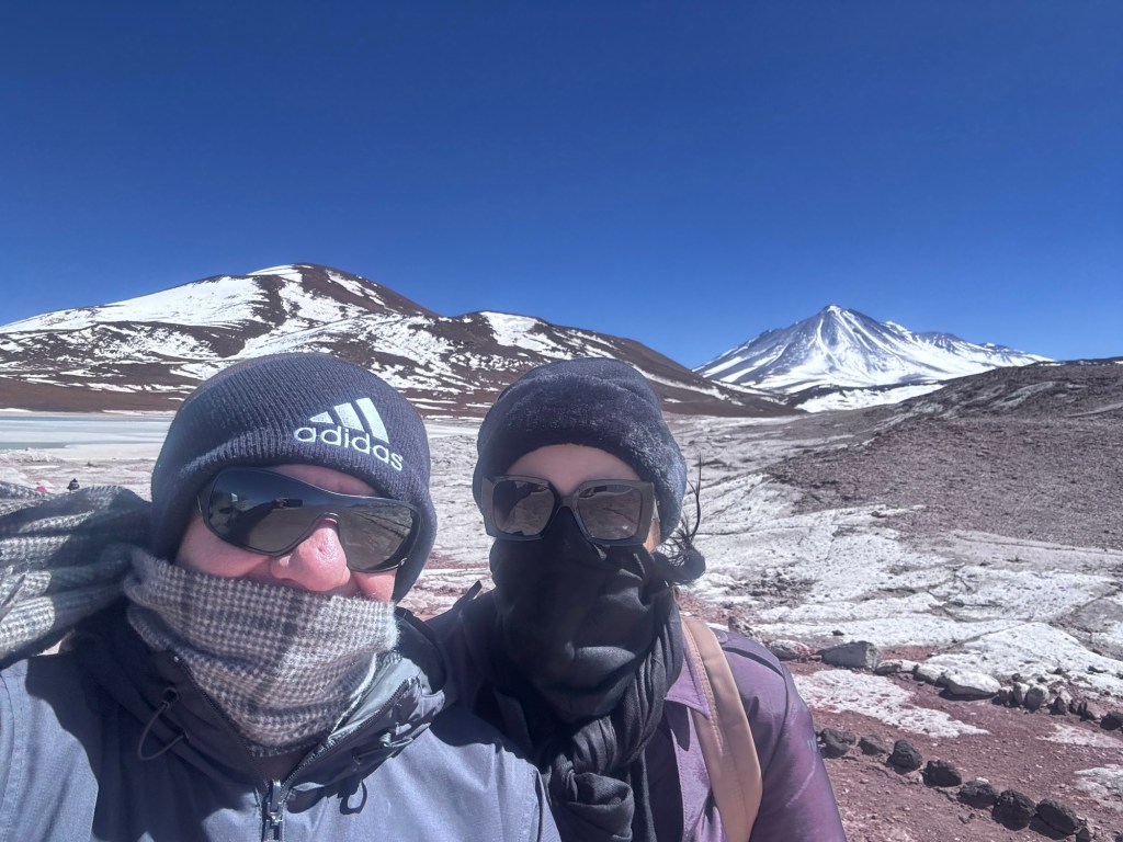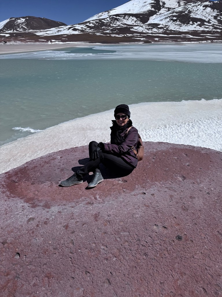 Às 11h03, alcançamos um dos pontos mais dramáticos de nossa jornada: Piedras Rojas, situado a vertiginosos 3.975 metros de altitude. As condições eram extremas – ventos de até 80 km/h e temperatura de apenas 4 graus Celsius. A paisagem era impressionante: formações rochosas avermelhadas contrastando com topos de montanhas nevadas ao redor e, à frente das pedras, um lago congelado que completava o cenário surreal.