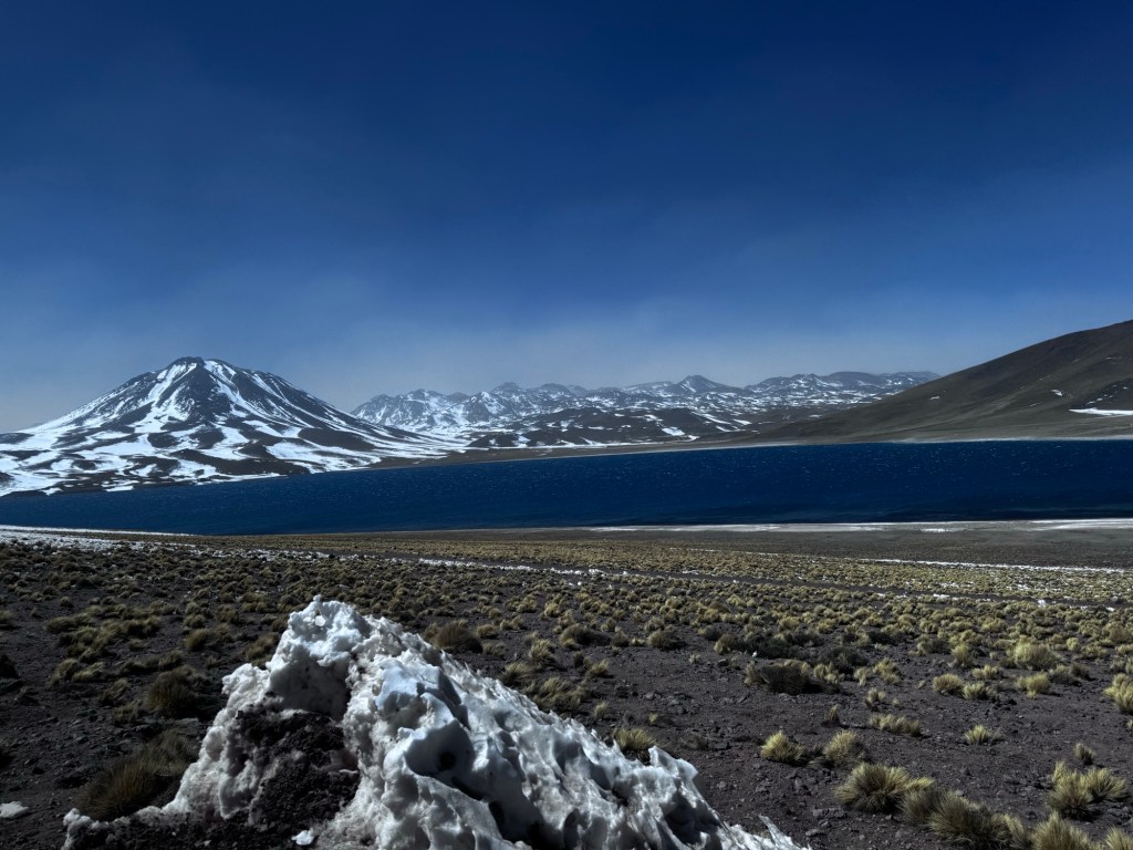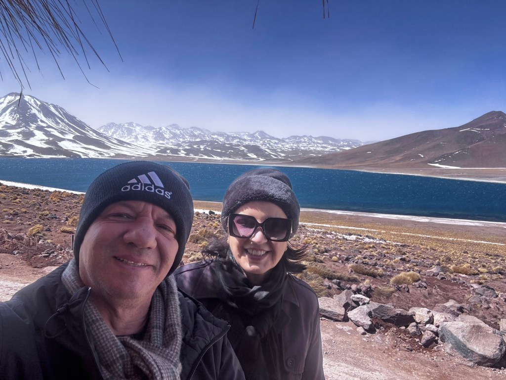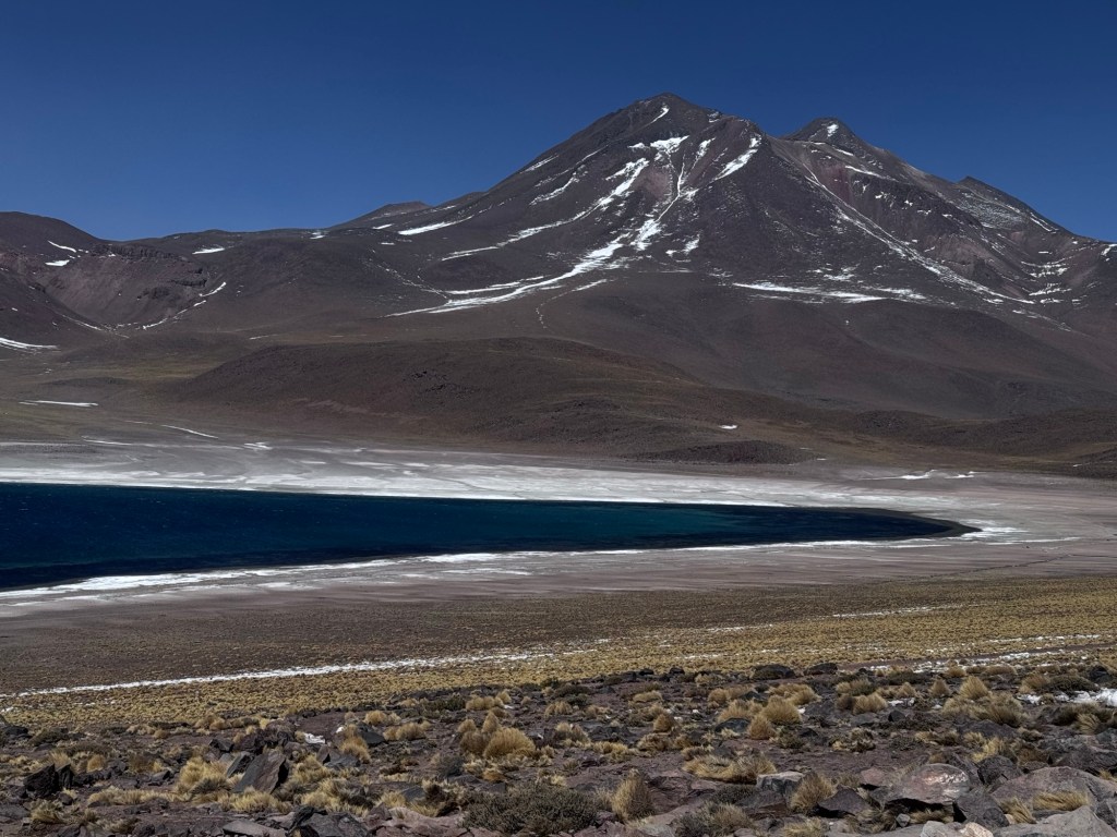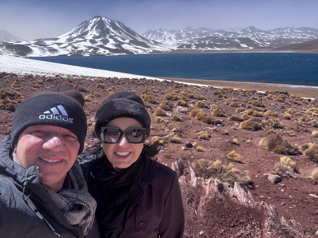 Às 12:50, atingimos os quase 4.300 metros de altitude nas Lagoas Altiplânicas, especificamente na Lagoa Miscanti. Neste ponto, estávamos literalmente tocando o céu, experimentando a sensação única de estar em um dos locais mais elevados acessíveis por turistas na América do Sul.