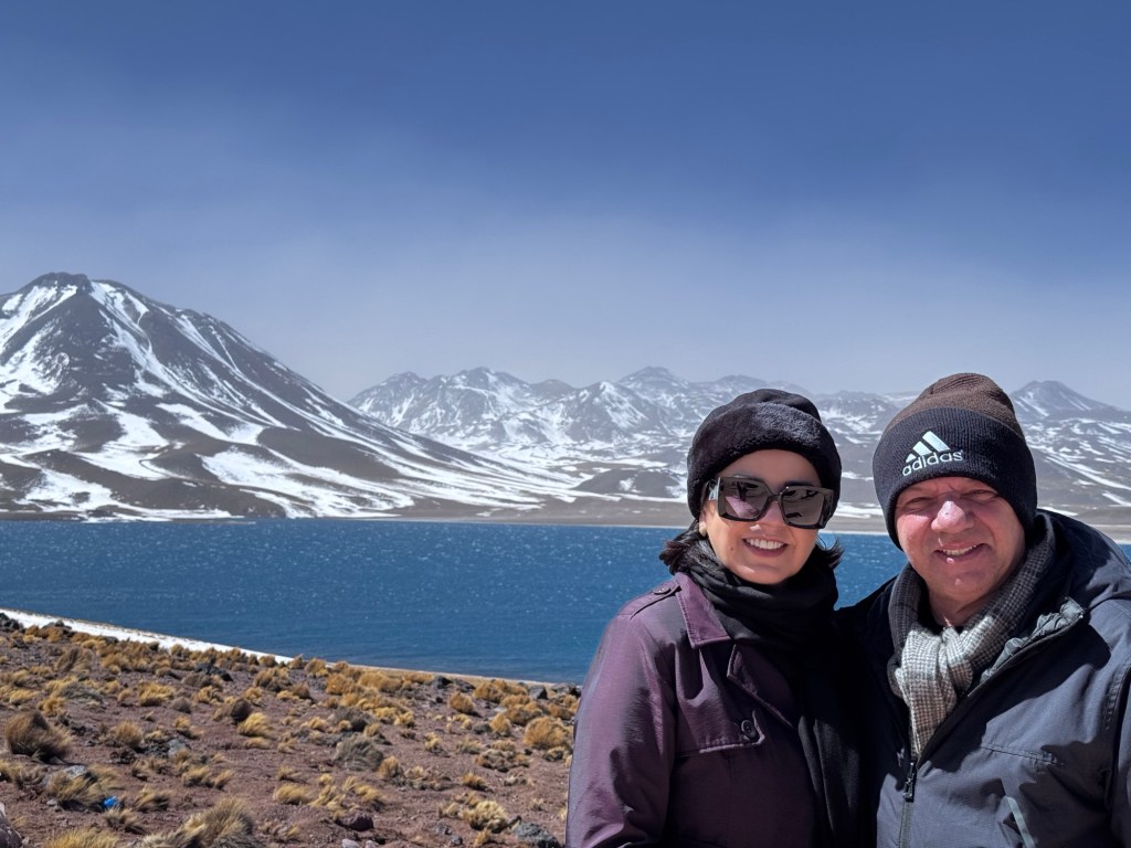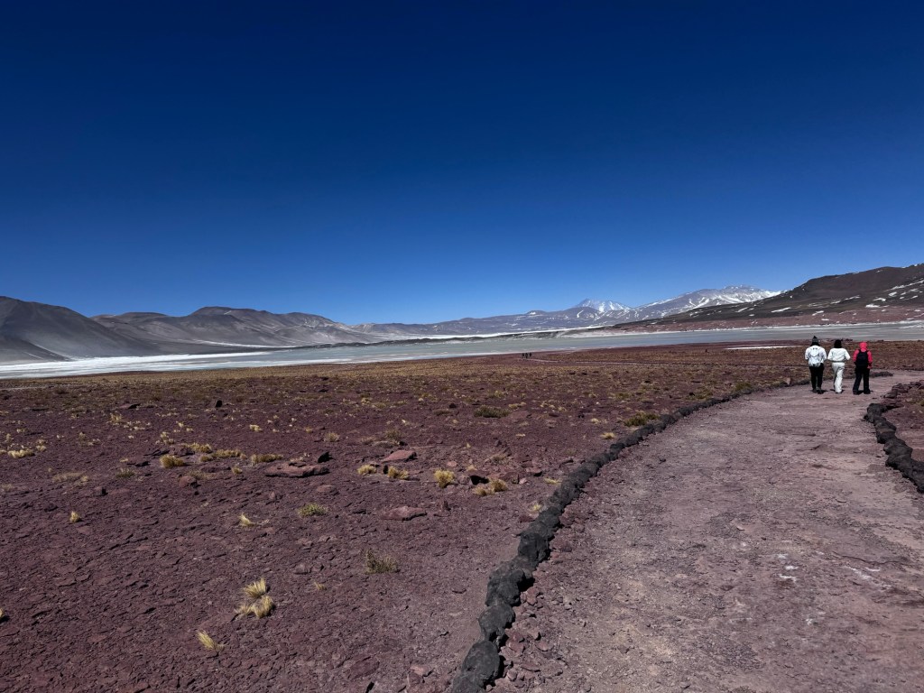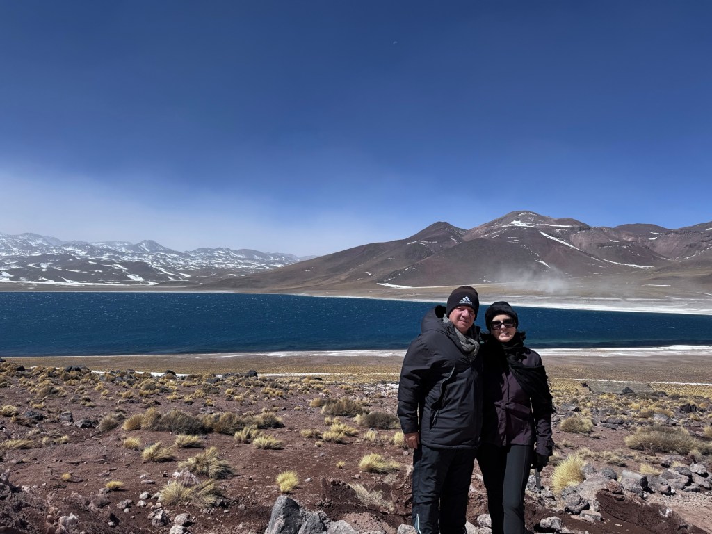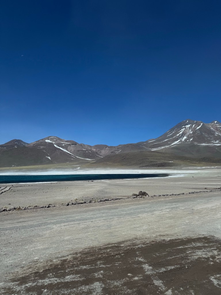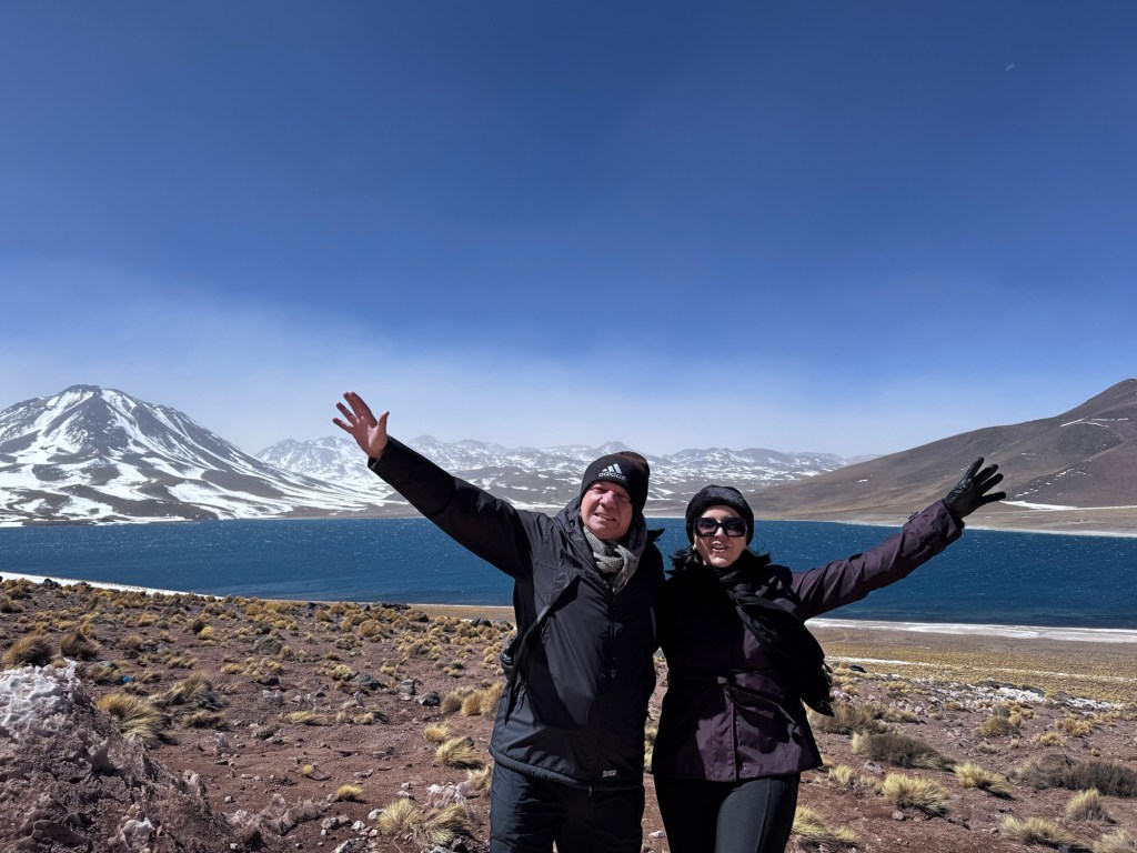 Às 12:50, atingimos os quase 4.300 metros de altitude nas Lagoas Altiplânicas, especificamente na Lagoa Miscanti. Neste ponto, estávamos literalmente tocando o céu, experimentando a sensação única de estar em um dos locais mais elevados acessíveis por turistas na América do Sul.