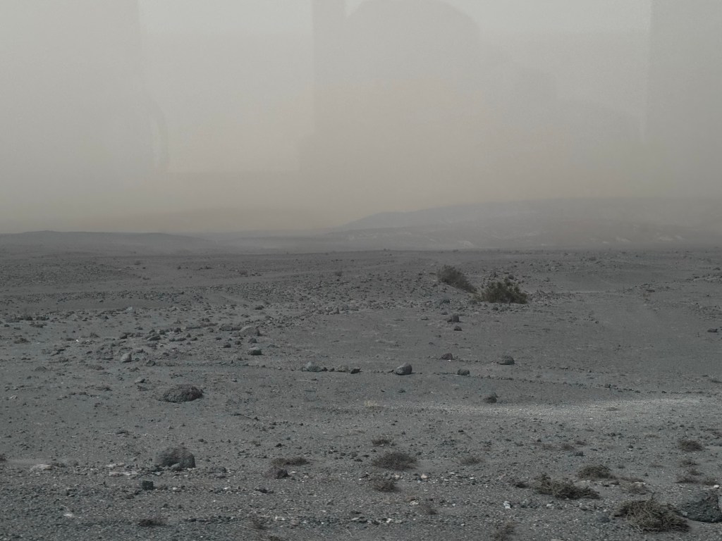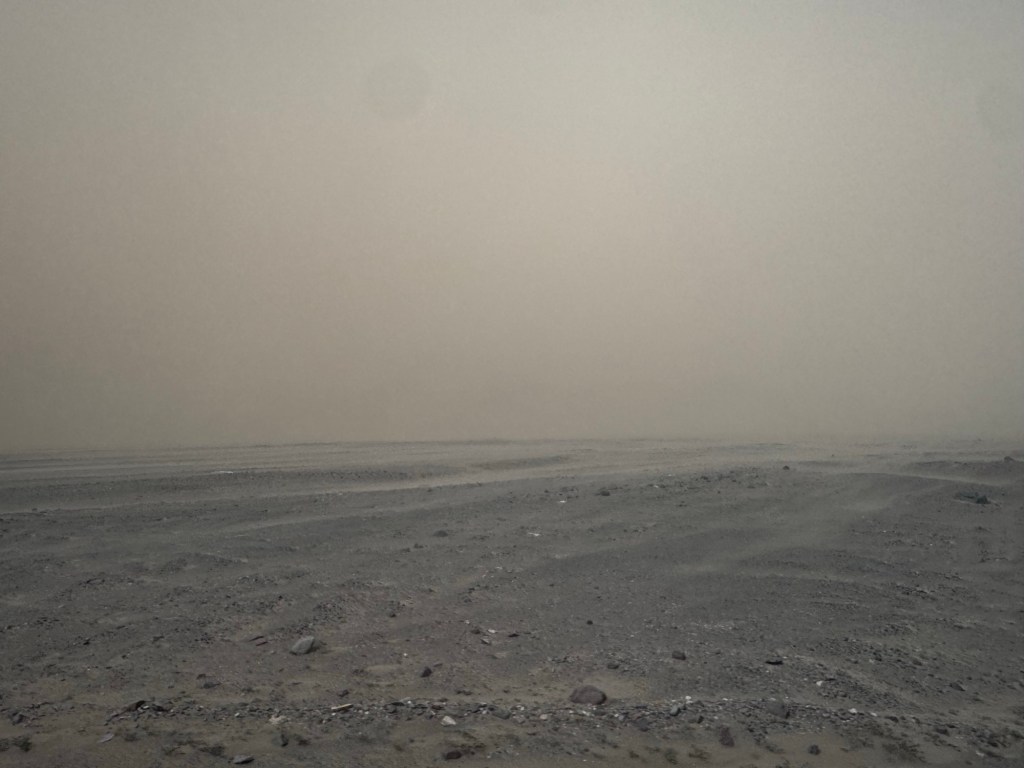 Registramos fotograficamente esta condição atmosférica única, onde o mundo ao nosso redor havia se transformado em tons monocromáticos da cor da areia do deserto.