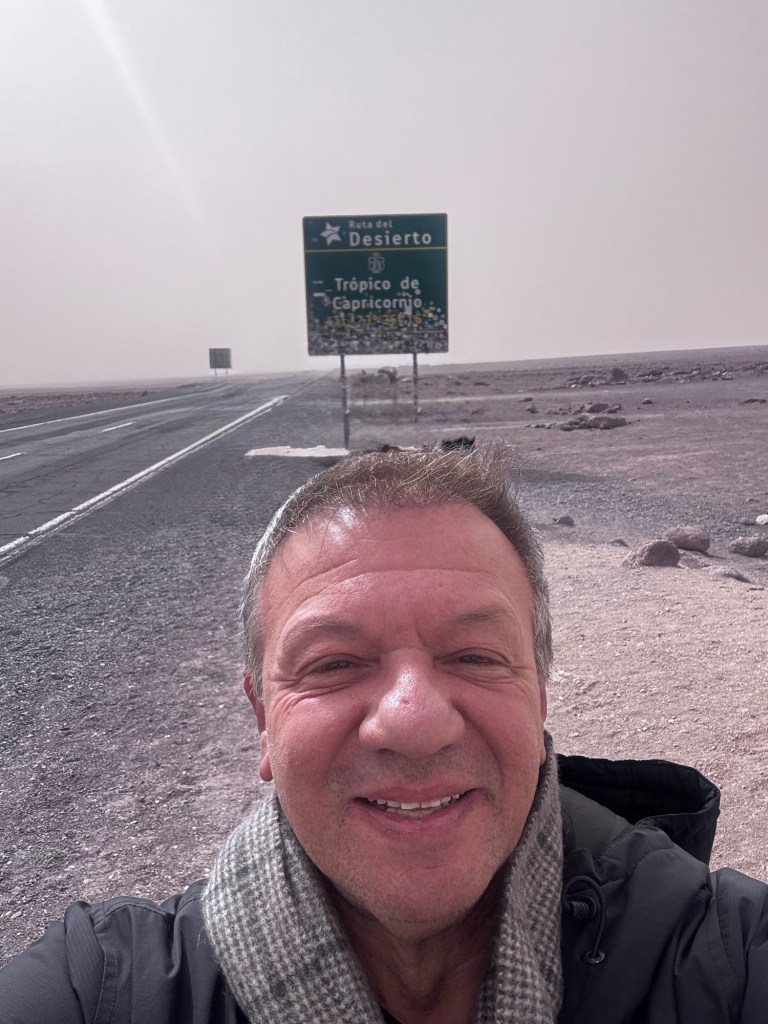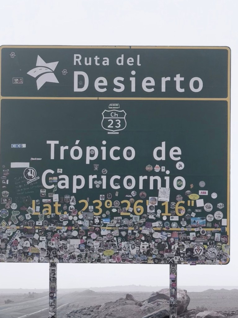 Nossa jornada culminou com uma visita à placa demarcatória do Trópico de Capricórnio. Novamente, as condições climáticas adversas – ventos intensos e a persistente névoa de areia – limitaram nossa permanência no local. Conseguimos apenas algumas fotografias rápidas da placa histórica que marca esta importante linha imaginária do nosso planeta.