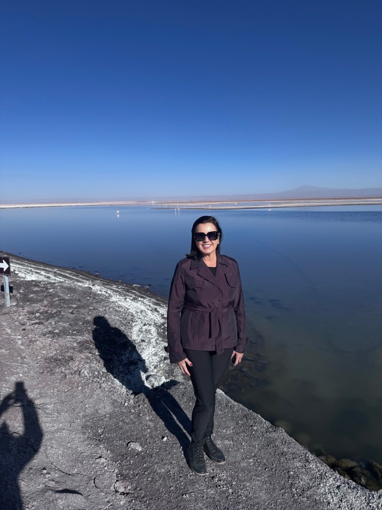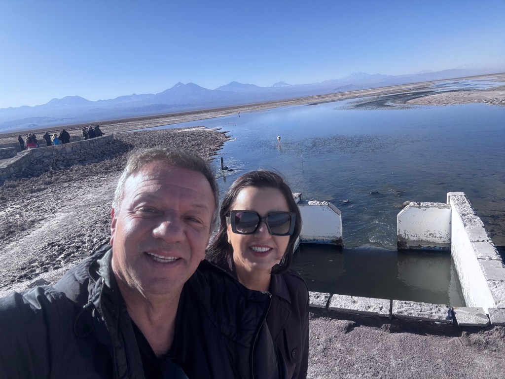 Após cerca de 40 minutos de van, chegamos ao nosso primeiro destino: a Lagoa Chaxa. Porém, descobrimos algo fascinante – a água que estávamos contemplando não era propriamente a Lagoa Chaxa, mas sim um canal com o nome peculiar de “Burro Morto”. Apesar do nome pouco atraente, o local é de uma beleza indescritível.