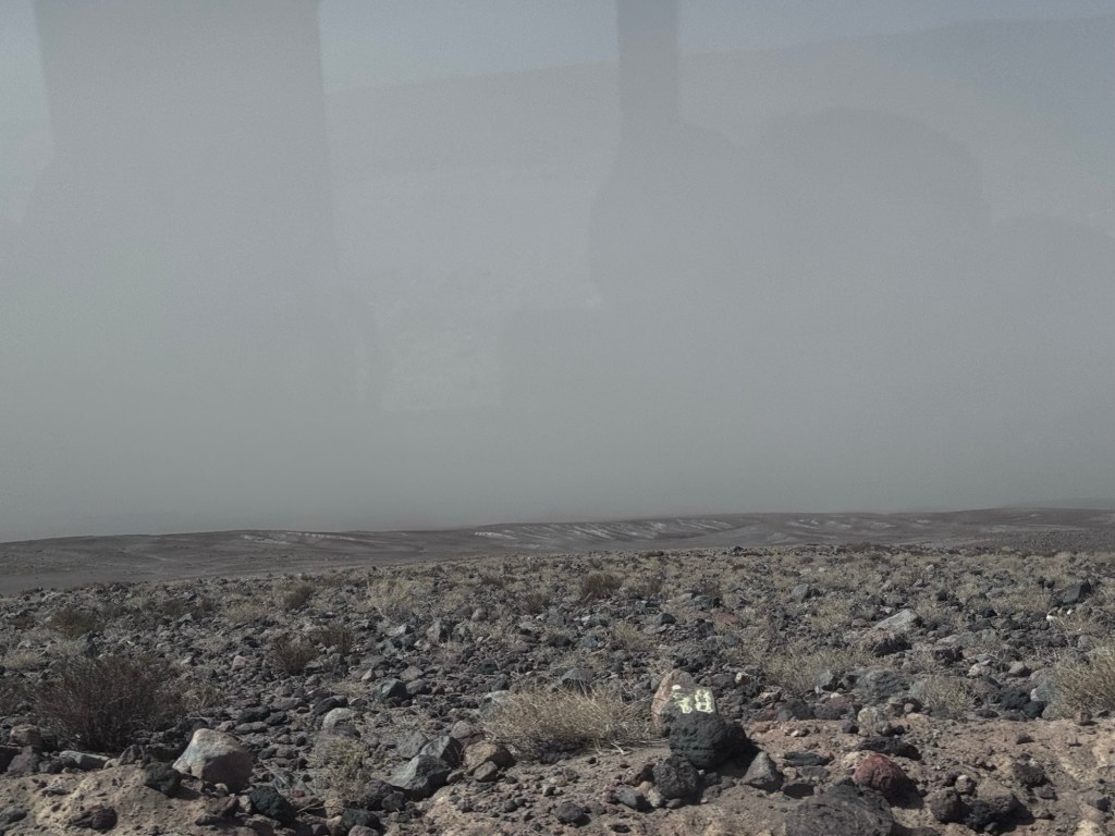 Nosso almoço estava programado novamente para Socaire, mas desta vez as condições climáticas ditaram uma mudança de planos. Em vez de almoçarmos ao ar livre como originalmente planejado, todos os grupos foram relocados para uma sala fechada. O motivo: ventos extremamente fortes carregavam areia pela atmosfera, criando uma névoa bege que tornava impossível enxergar o céu e reduzia drasticamente a visibilidade.