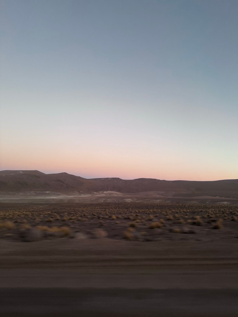Com tudo escuro lá fora, recebemos a orientação de que o melhor seria descansar durante a viagem. As luzes da van foram apagadas para que pudéssemos dormir durante o trajeto de aproximadamente 1h20, que nos levaria de 2.400 metros de altitude em San Pedro até os impressionantes 4.320 metros dos Geysers del Tatio. A chegada estava prevista para as 6h45.
