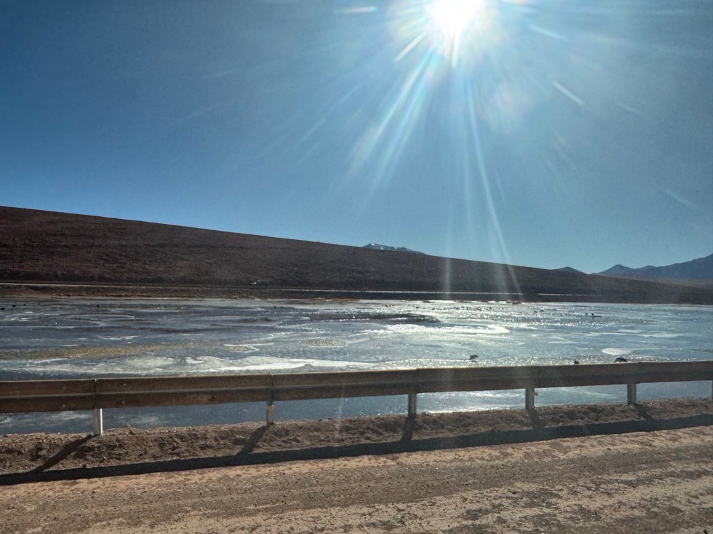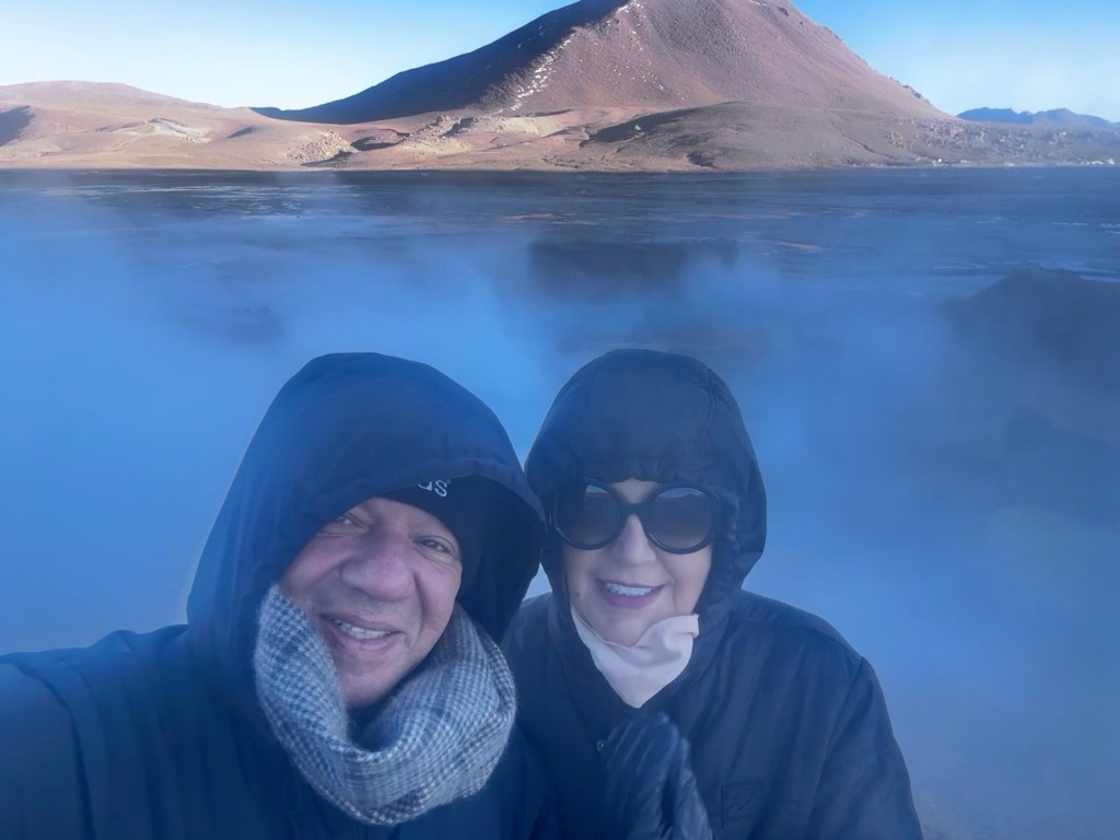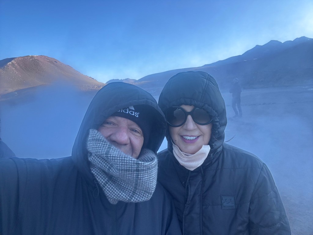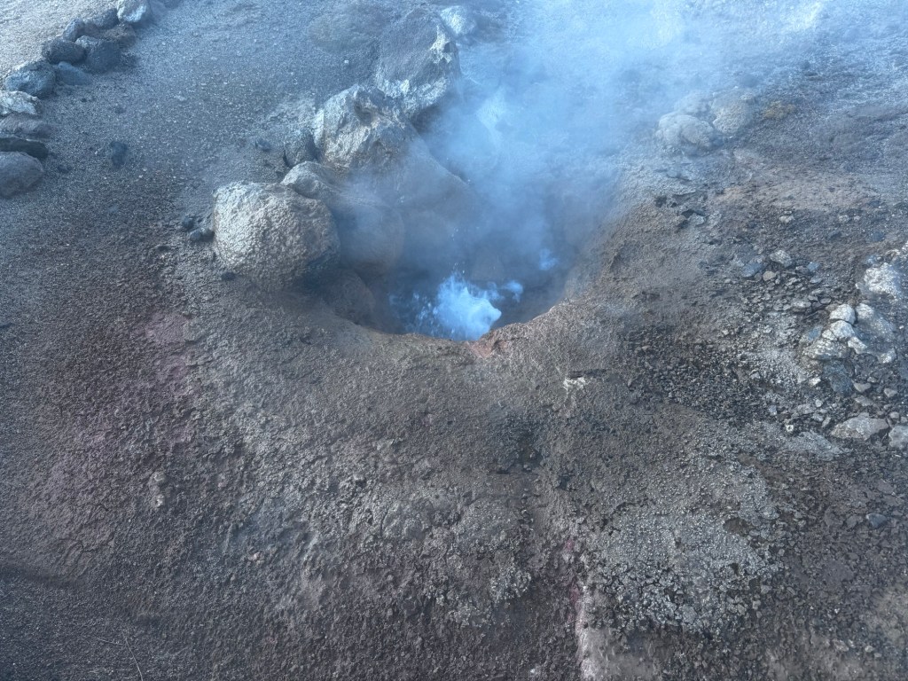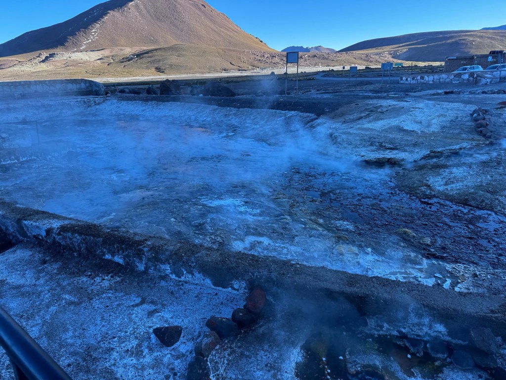 Descobrimos que estávamos no maior campo geotérmico do hemisfério sul. Esta área impressionante no Chile abrange mais de 10 km² e conta com aproximadamente 90 geysers. É o segundo campo geotérmico mais alto do mundo, situado a 4.200 metros de altura – superado apenas pelo campo geotérmico boliviano, localizado do outro lado dos vulcões.