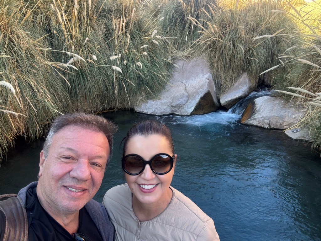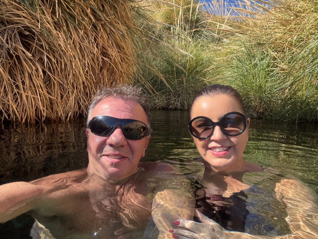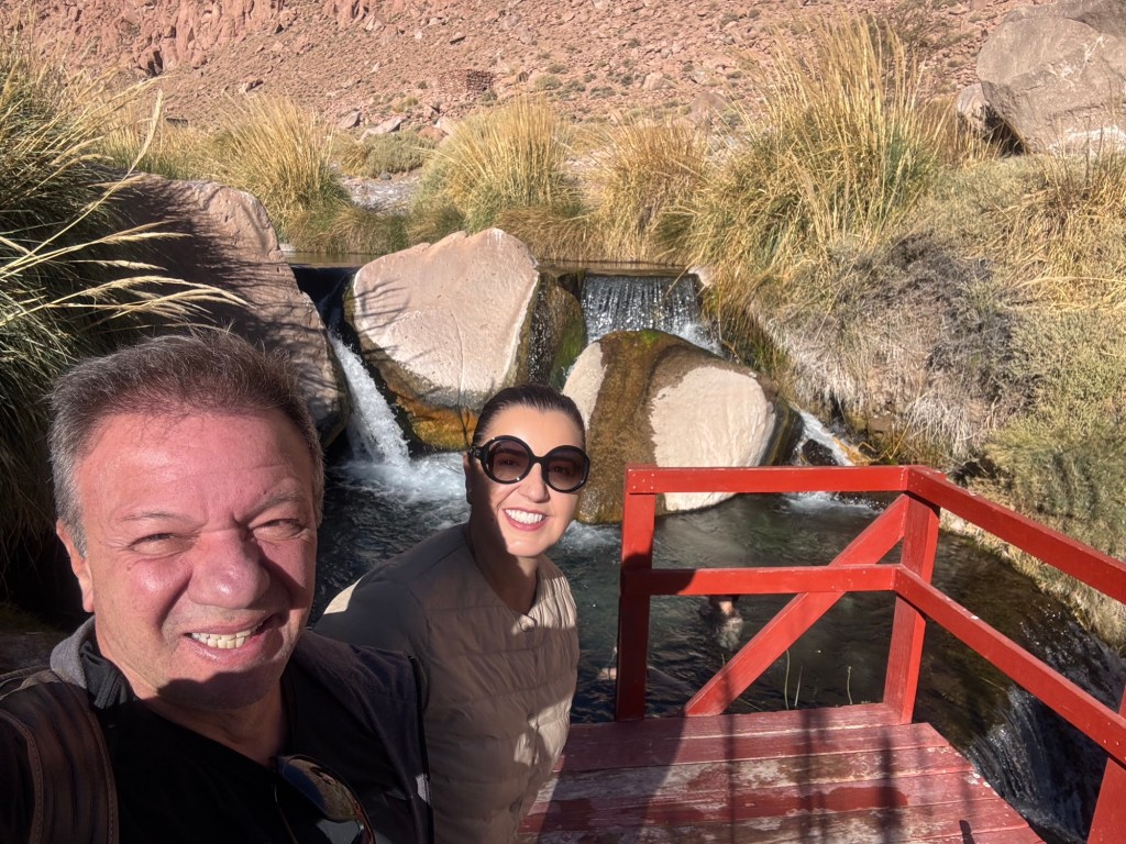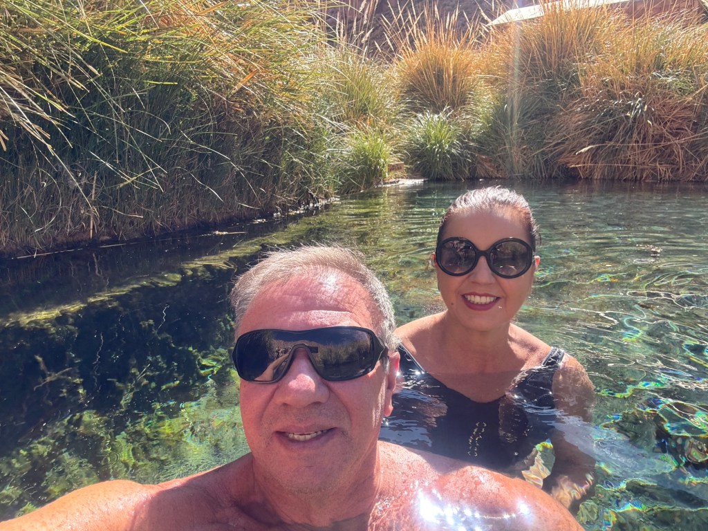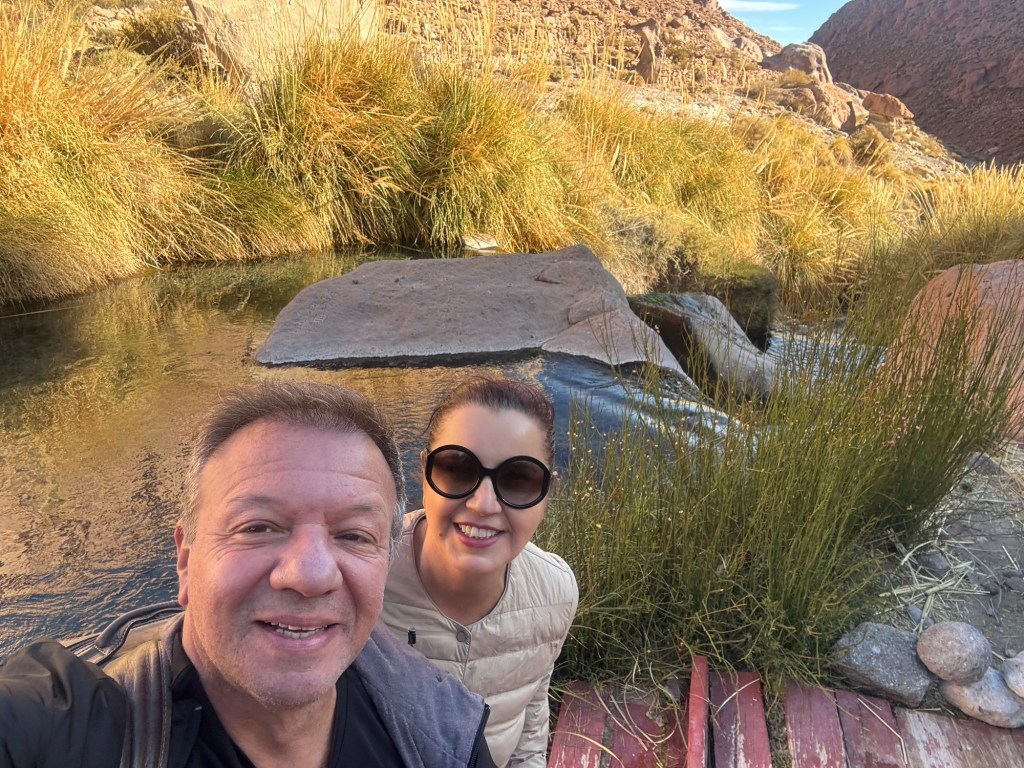 O contraste da água quente com o ar frio da altitude criou uma sensação incrível. Mesmo com o sol forte do deserto, a brisa constante mantinha a temperatura ambiente agradável, tornando o banho ainda mais revigorante.