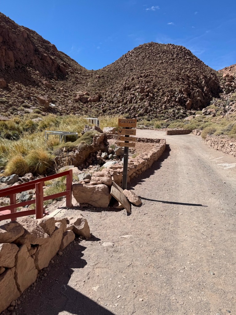Durante o percurso de 30 quilômetros, pudemos observar a mudança na vegetação e no relevo, saindo do centro de San Pedro de Atacama a 2.400 metros de altitude e subindo até os 3.500 metros onde se localizam as thermas.