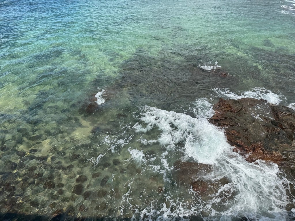 A praia em frente ao hotel tem suas características peculiares, com muitas pedras que criam pequenas piscinas naturais na maré baixa.