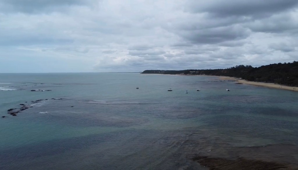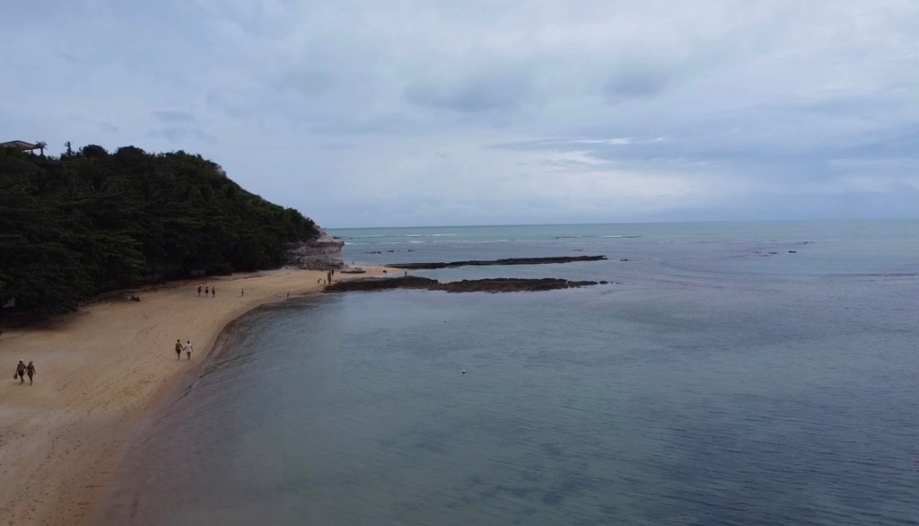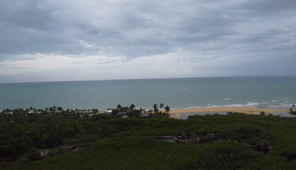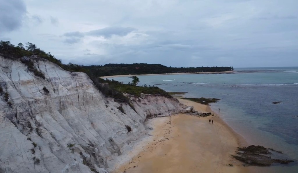 Voo de drone na Praia de Mucugê, com vistas muito bonitas.