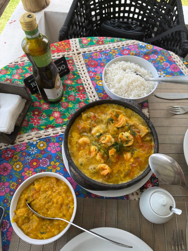 Retornamos ao Restaurante e comemos uma deliciosa Moqueca de Peixe e Camarão, com pirão e arroz.